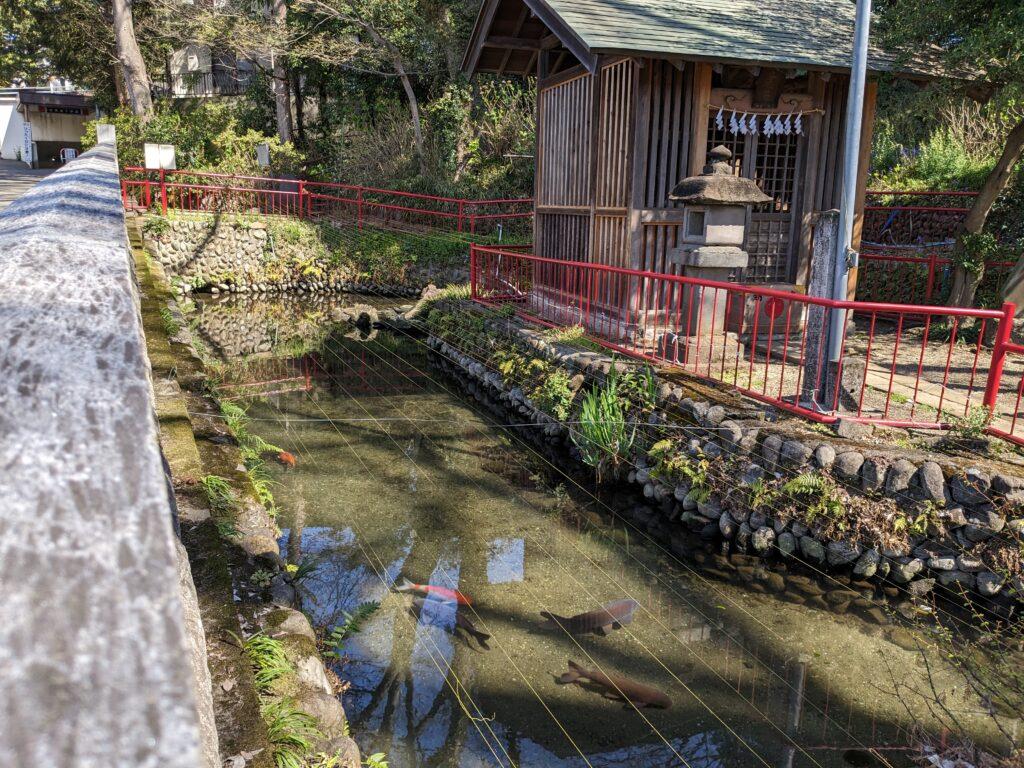 拝殿、本殿の後ろにひっそり鎮座する「厳島神社」も見逃せません。周囲の池には湧水が流れ込み、その透明度の高さに心が洗われます。魚たちが気持ちよさそうに泳ぐ姿に、癒やされました。