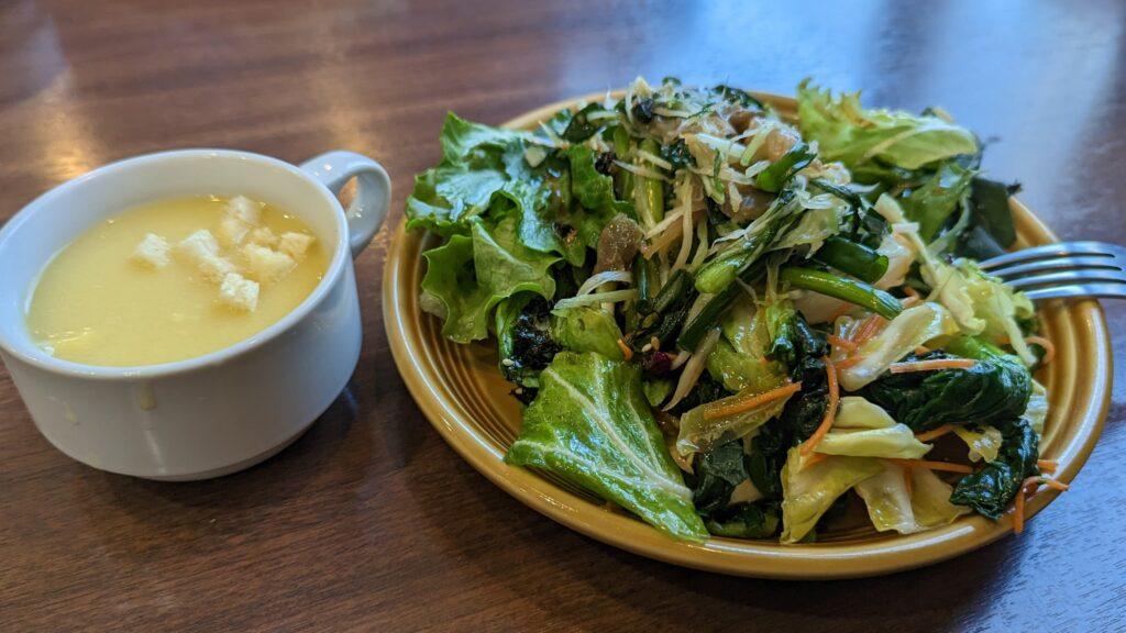 創業昭和8年という「肉の名門、街の焼肉レストラン」。安くておいしいと評判のお店です! 歩き旅の疲れを吹き飛ばすべく、サラダバー付きのがっつりハンバーグを注文!「午後からの歩きに影響が出るかも…」という心配をよそに、ペロリと完食。やっぱり旅の途中のご飯は最高に美味しいですね!エネルギーをしっかり補給できました!