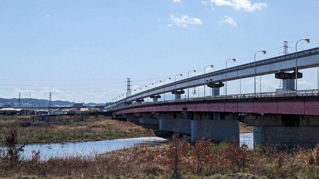 多摩川の土手に出ると、モノレールが走る「立日橋(たちひばし)」が目の前に現れます。この橋が、立川市と日野市を結ぶ境界線。いよいよ日野市へと足を踏み入れます!モノレールの橋梁と景色が一体となって、独特な風景が広がっていますね。