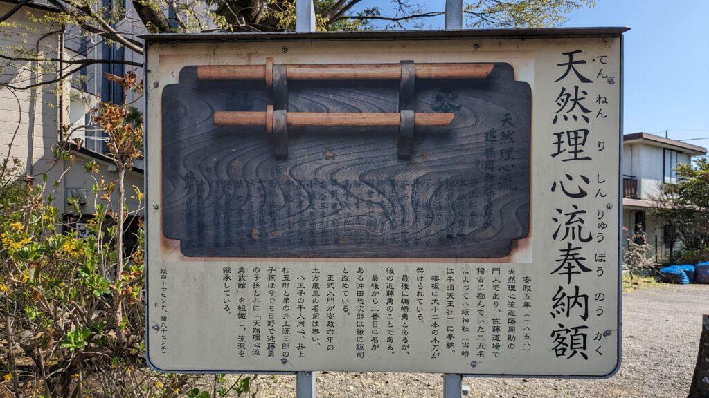 この神社には、新選組が身につけていた剣術流派である「天然理心流」の奉納額(レプリカ)が掲げられています。後の新選組局長・近藤勇や、沖田総司、井上源三郎ら天然理心流の門人たちが剣術の上達を願って奉納したのでしょうか。