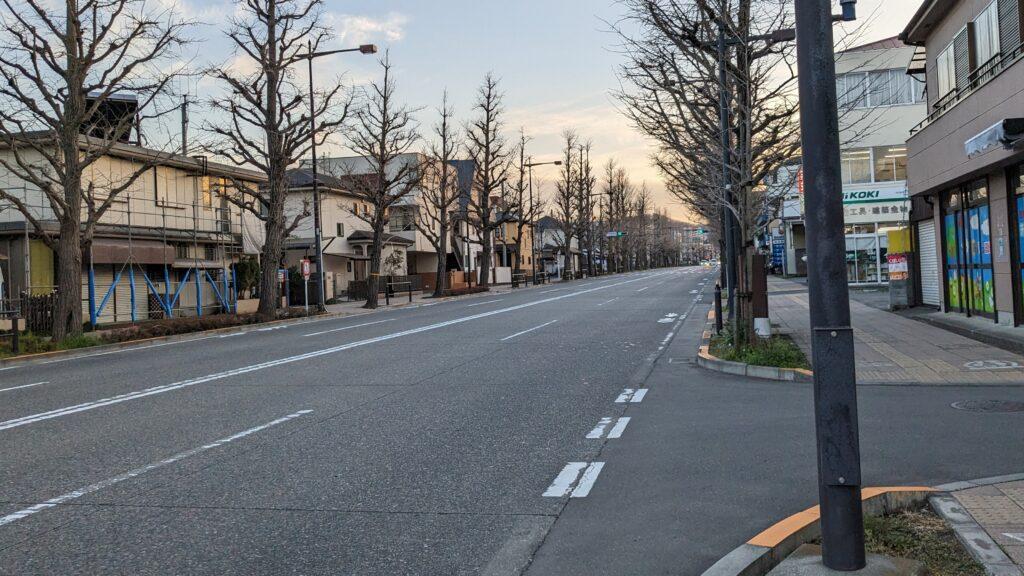 47km地点を通過し、追分からは景色が単調になってきます。イチョウ並木が続く長い直線。陽もだいぶ落ちてきて、周囲が徐々に薄暗くなってきました。