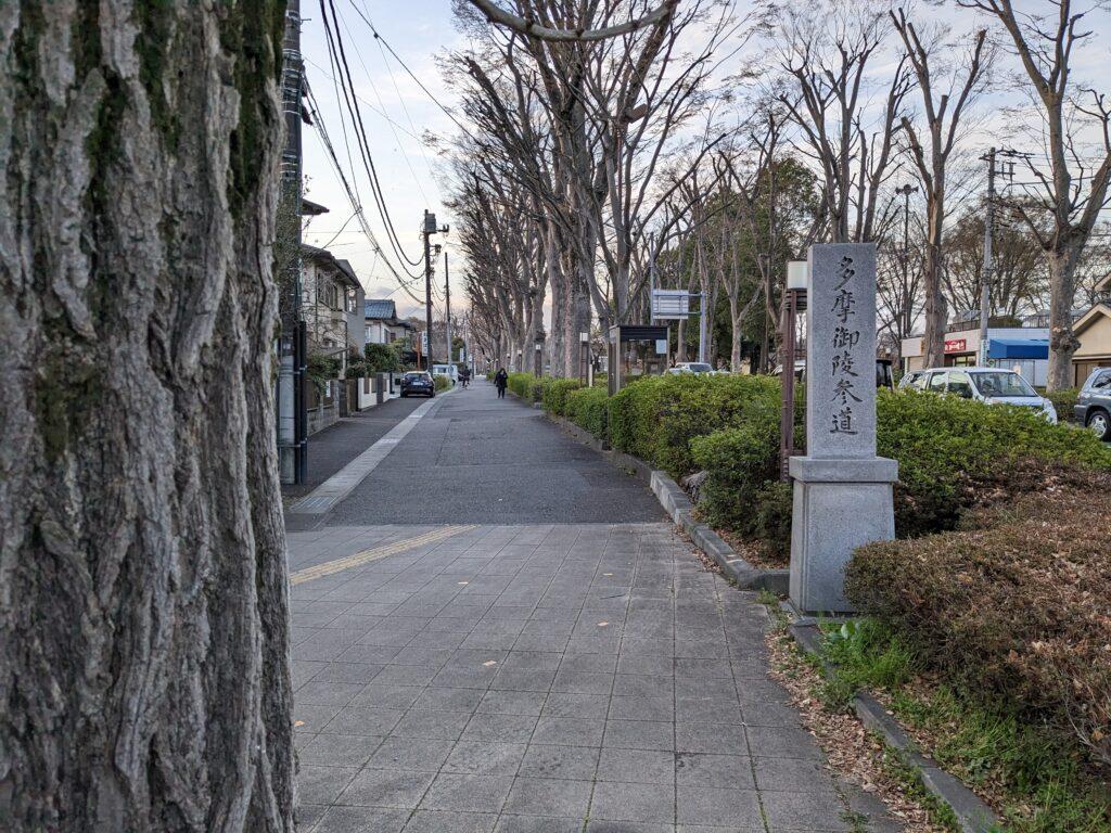 多摩御陵参道に差し掛かります。この立派な参道を進むと、「武蔵御陵墓地(多摩御陵)」に辿り着きます。ここは、大正天皇、貞明皇后、昭和天皇、香淳皇后が眠る、都内唯一の皇室墓地。