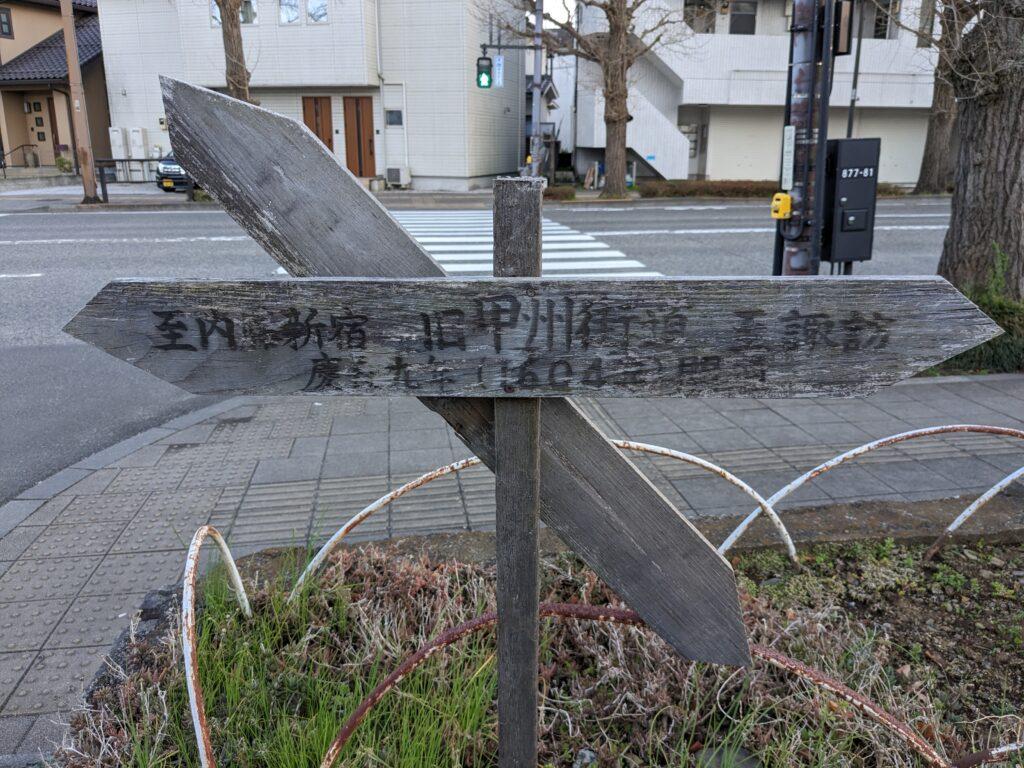 分岐に案内板があります。新道から外れてコンビニの裏側の道を進みます。