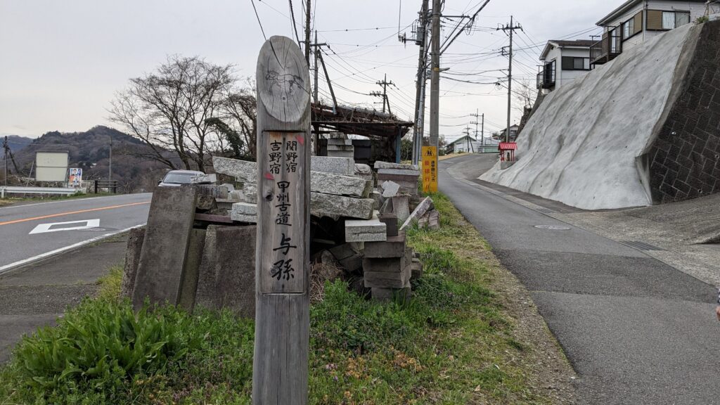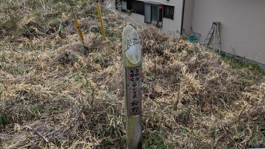 道標の右手にある坂道を進むと、行き止まりになりますが、ここが本来の旧甲州街道です。その突端には「与瀬の一里塚」があります。木柱はかなり朽ちていますね。訪れる人が少ないのかもしれません。行き止まりなので、先ほどの道標の分岐まで引き返すことにします。