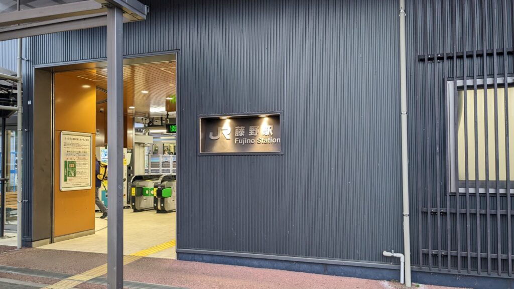 藤野駅に無事到着しました!相模湖付近で少し心が折れそうになりながらも、何とかここまで歩き続けました。藤野駅までの道のりがとても長く感じましたが、予定通りに目標地点まで辿り着けたことに大きな達成感を感じました。