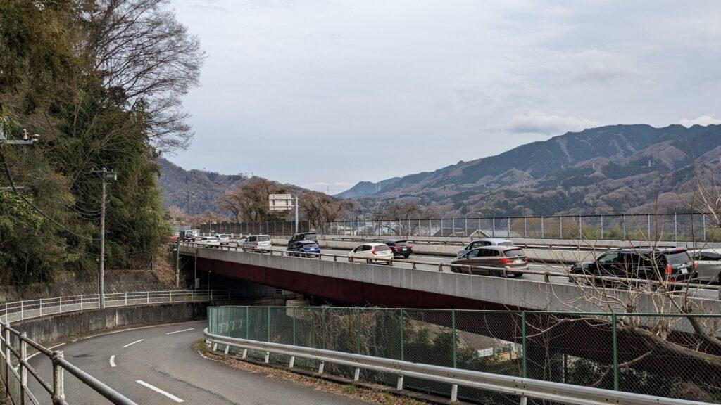 中央道を走る車が見えます。写真の奥側が東京方面です。少し渋滞している様子が見えますね。これが名物「小仏渋滞」ゾーンです。