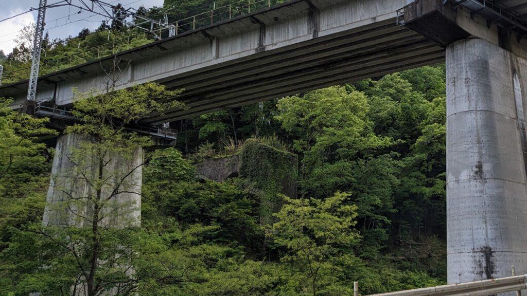 橋梁の奥に見える四角い建造物は、「旧第3笹子川橋梁」の橋台です。かつてはここにトラス構造の橋桁が架かっていたそうです。当時の鉄道技術を感じさせる貴重な遺構ですね。