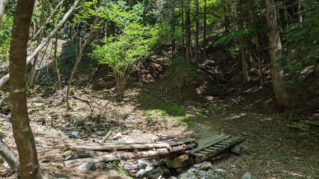 しばらく歩くと橋の先に階段が現れます。