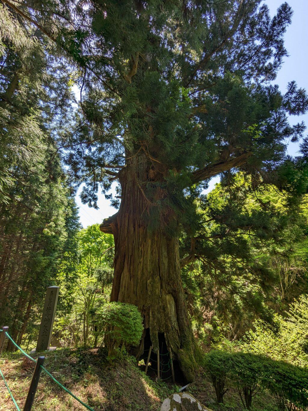 樹齢は約1000年、樹高は約28メートル、根回りは約14.8メートル、目通り幹囲は約9メートルもあるブ。戦国時代、合戦に赴く武士がこの杉に矢を射立てて戦勝を祈願したと伝えられているブ。