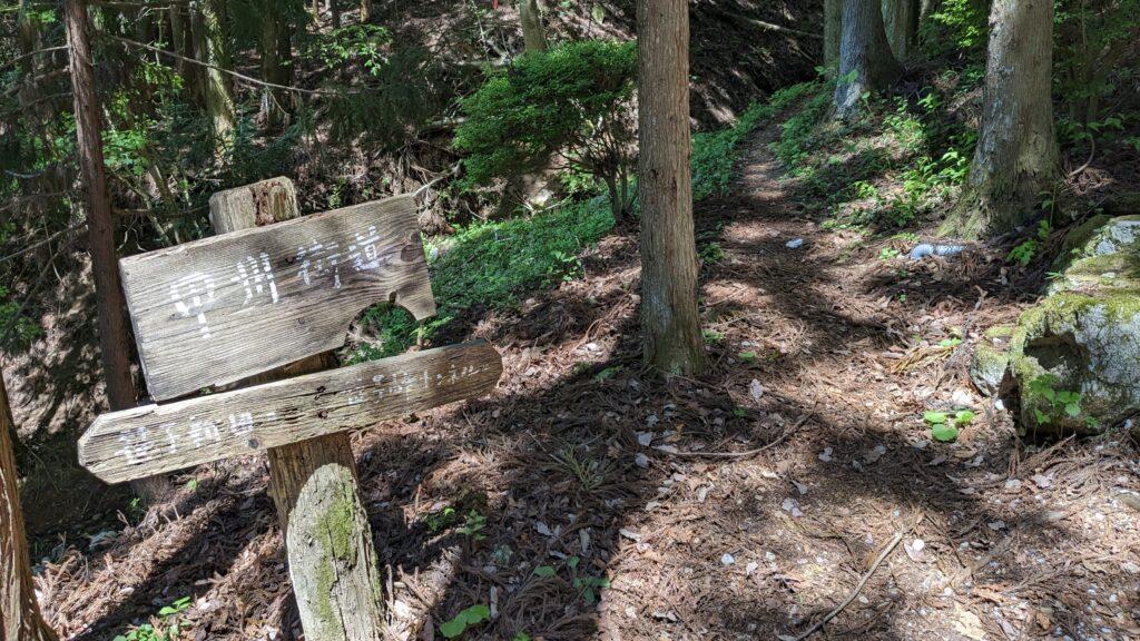 写真では分かり難いですが、この案内板の左側に山道があるので入って行きます。