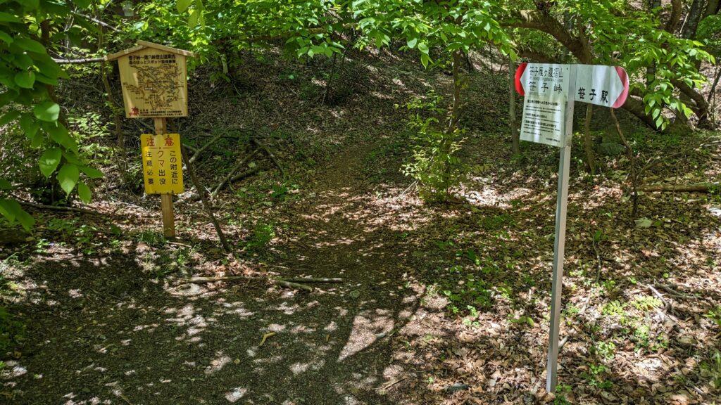 ゆっくりとお昼休憩を取り、再び歩き始めます。トンネルを通過するのかと思いきや、駐車スペース脇の案内板は山道を指し示しています。さらに、「熊出没注意」の表示もあり、慎重な行動が求められます。安全のため、熊ベルをしっかりと鳴らしながら進んでいきましょう。
