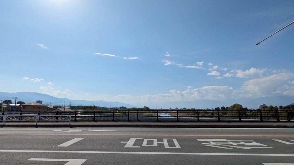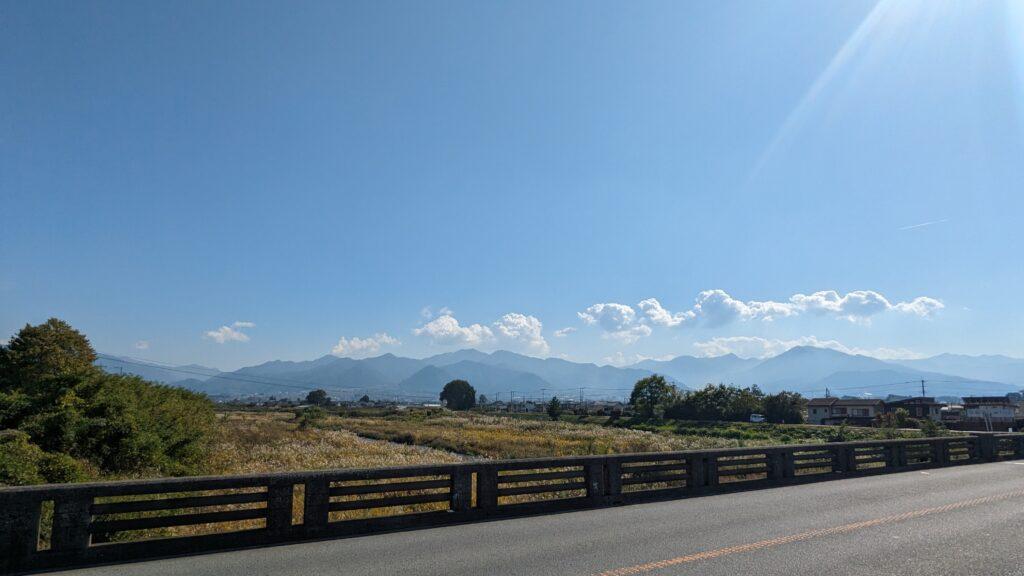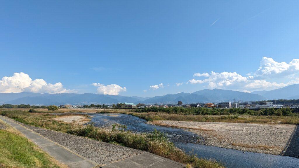 再び「称名院」の交差点に戻り、今度は南へ進みます。道を進むと突き当たりには笛吹川の支流「日川」が流れており、開けた場所からは心地よい景色が広がっています。富士山が見えなかったのは残念です。