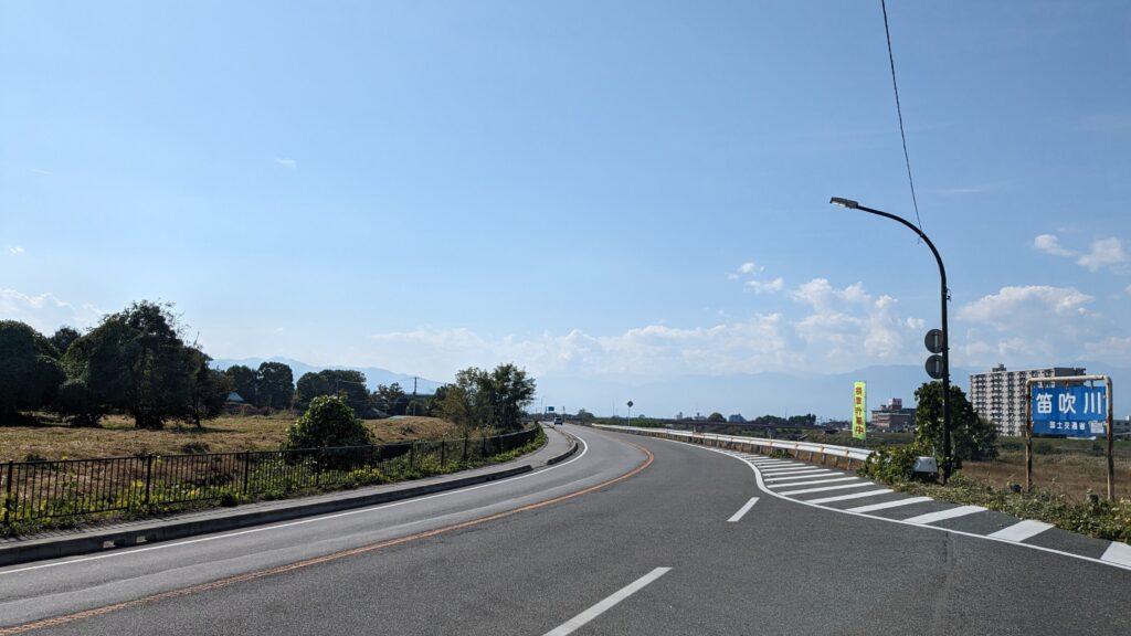 しばらく歩くと、本流笛吹川沿いの道に変わり、また交通量のある国道411号と合流し、川沿いを進むと、笛吹川に架かる大橋「笛吹橋」があります。