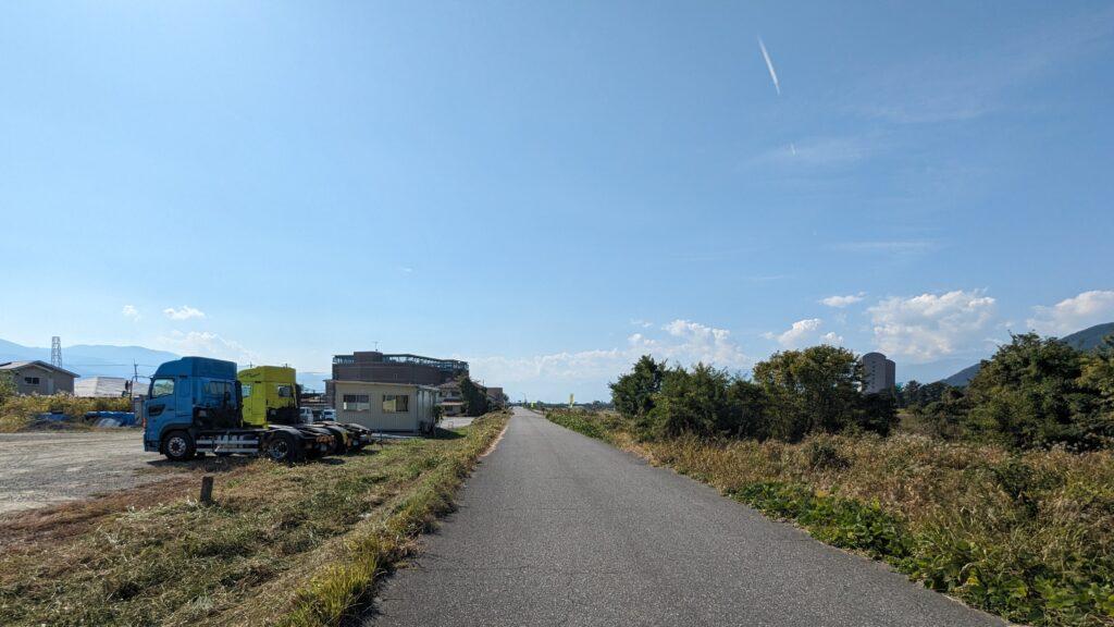 日川橋を渡った後、すぐに日川沿いの西側の道を進みます。道は穏やかで、周囲には民家が点在しており、交通量も少ないため、のんびりとした雰囲気が広がります。