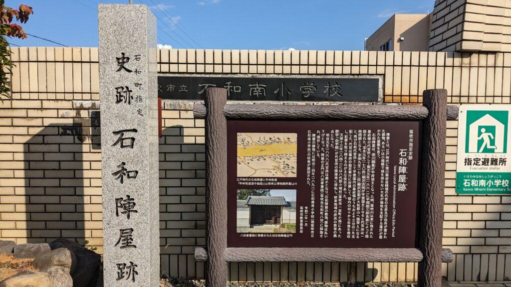 「小林公園」の脇道を入っていったところ、石和南小学校の入口脇に「石和陣屋跡」があります。かつてここに代官所が合ったそうです。