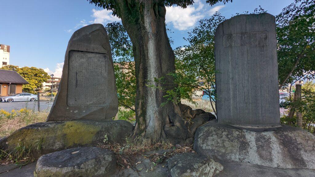 道標の隣に立っている大木の陰にも大きな2つの石碑が立っています。