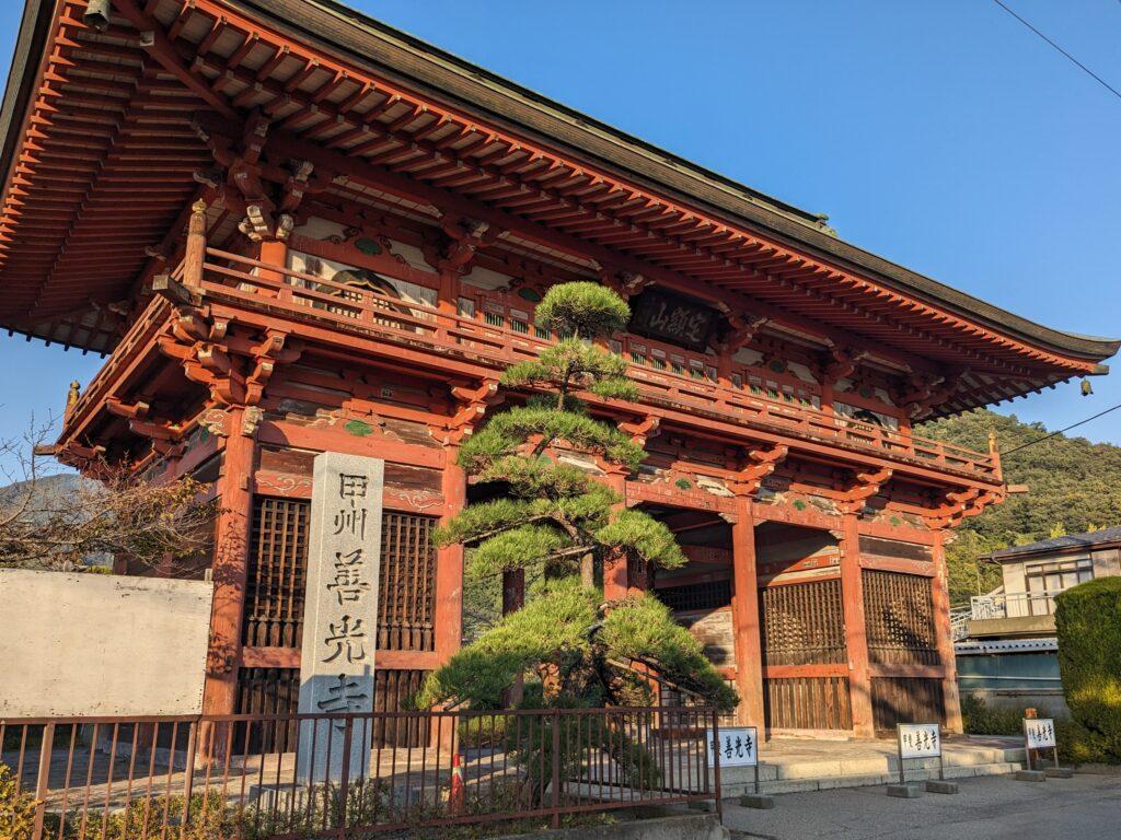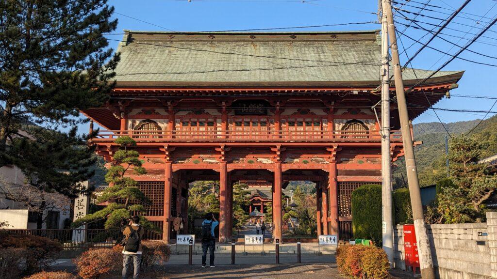 甲州街道の「善光寺入口」交差点を北にむかって10分ほど歩くと、正面に巨大な朱塗りの山門が見えてきます。さすがは国の重要文化財。堂々たる佇まいです。