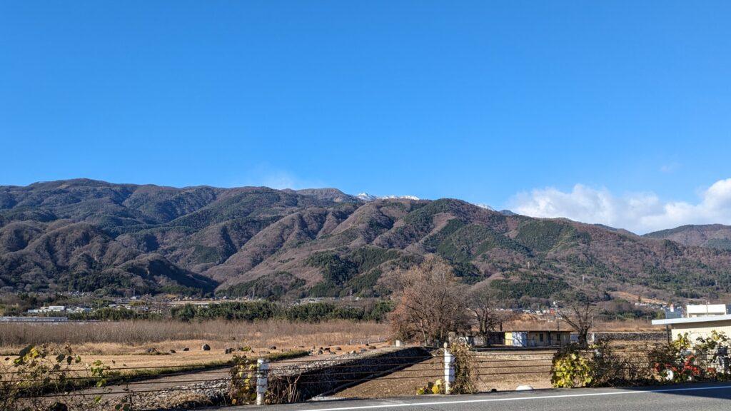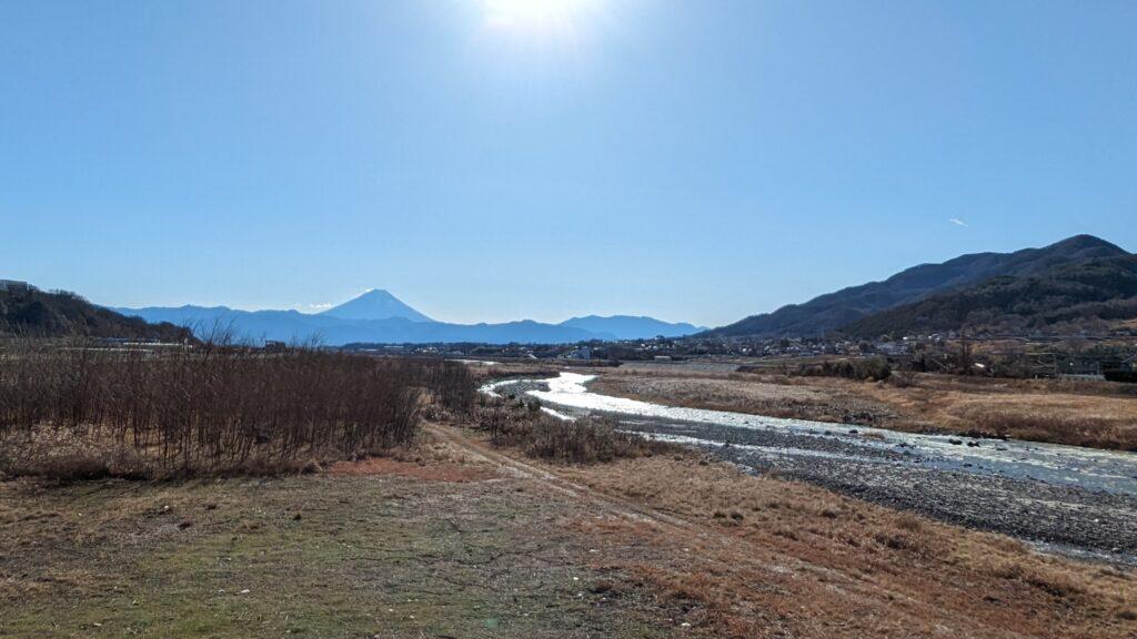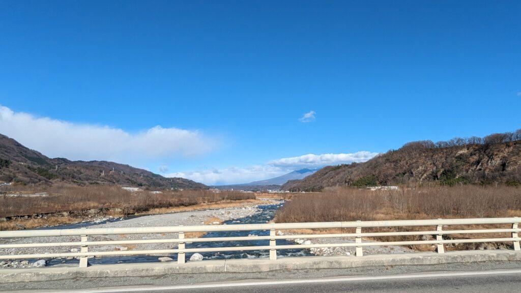 前景の釜無川流れとても綺麗な景色です。強風で波立っているのがわかるでしょうか。