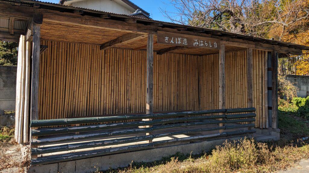 カフェの入口に「さんぽ道みはらし台」という休憩場所がありました。雰囲気ありますね。