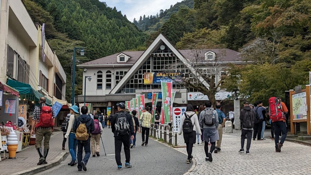 朝9時に高尾山口駅に到着。紅葉シーズン前なら少しは空いているかと思いましたが、すでに駅周辺や登山口へ向かう道は、多くの人で賑わっていました。