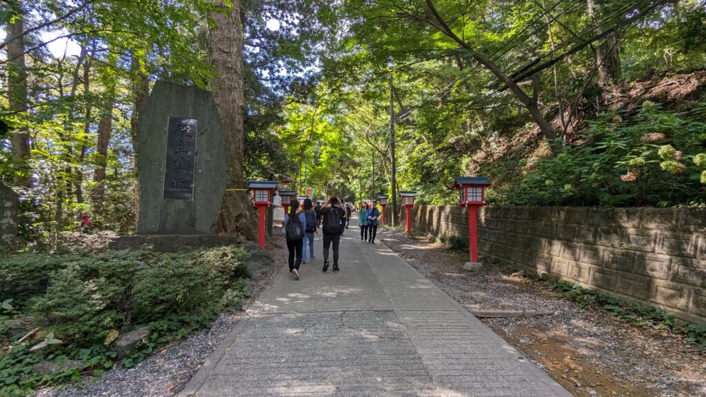 門をくぐると、両側に赤い灯篭が並ぶ美しい参道が続いています。