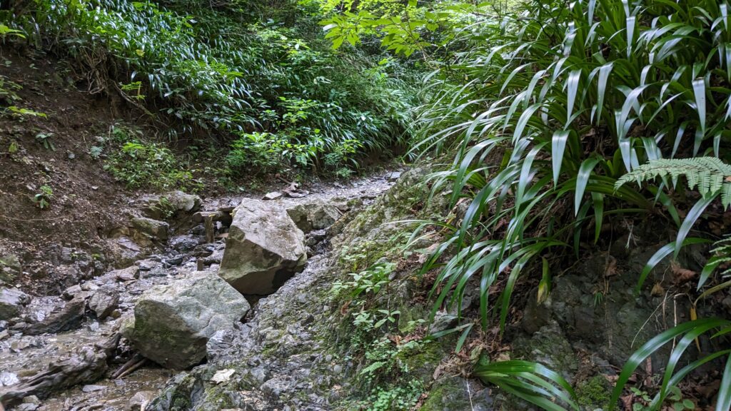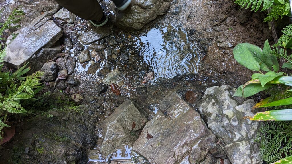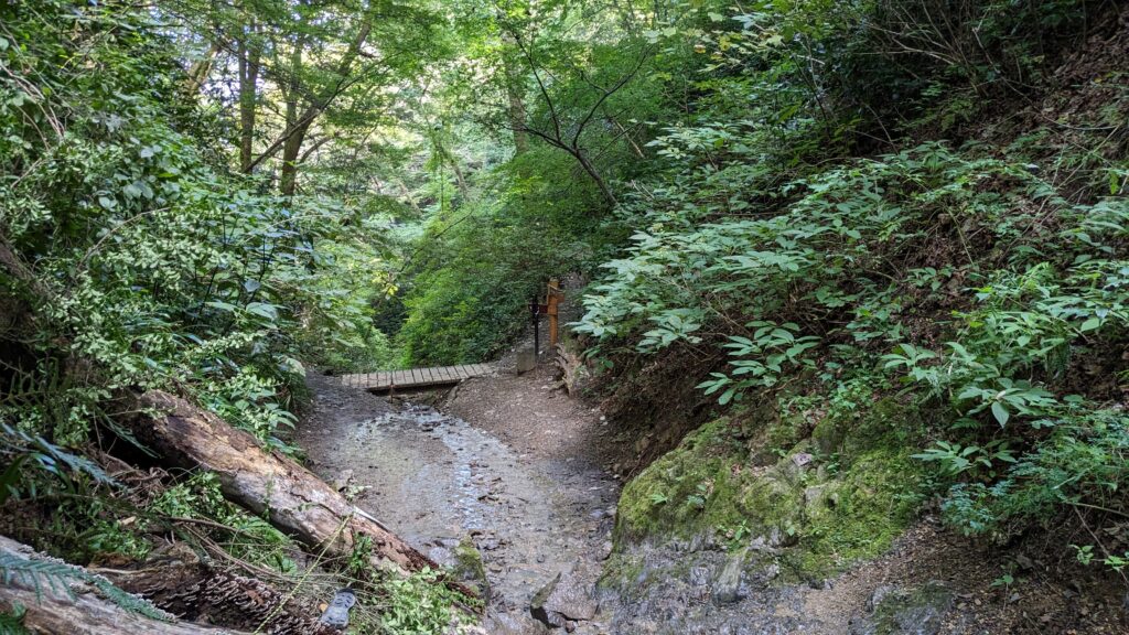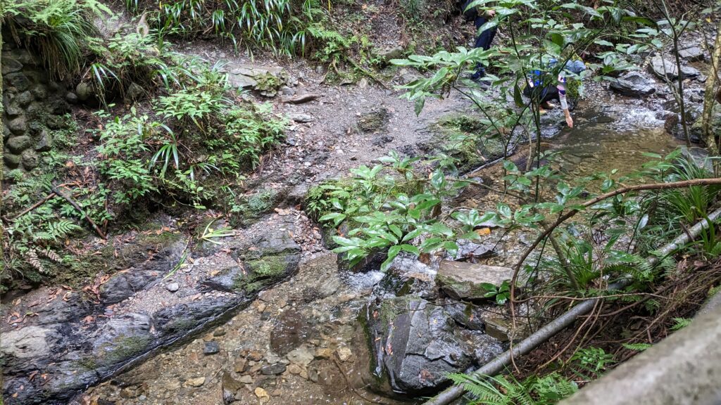 沢に並行した道になるので、ぬかるみが点在していて、濡れた石、木などで滑り易くなっています。