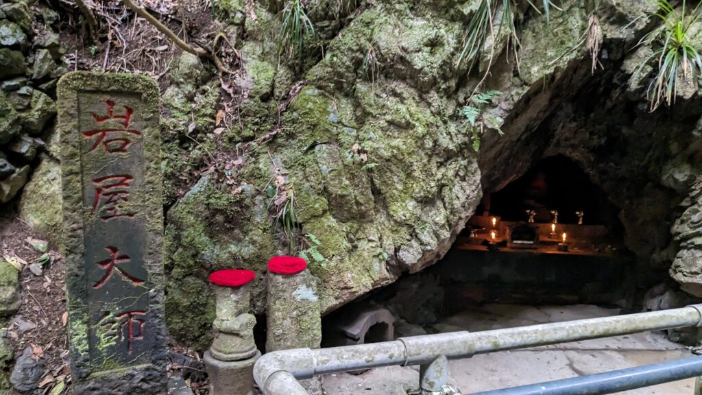 弘法大師が高尾山を登拝した際、嵐の中で病の母親と娘に出会いました。弘法大師はお祈りを捧げるとこの洞窟が現れ、親子はここで嵐をしのいだという伝説が残っています。