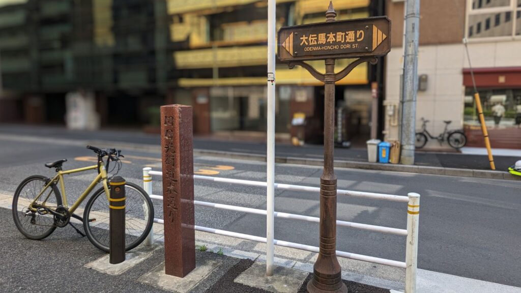 街道に戻り「室町三丁目南」の交差点に到着しました。ここは短い距離ながらも分岐点であり、「中山道」と「日光街道」が別れる場所です。北へ真っ直ぐ進むと「中山道」、東に向かうのが「日光街道」。それぞれ異なる旅路へと続いていきます。