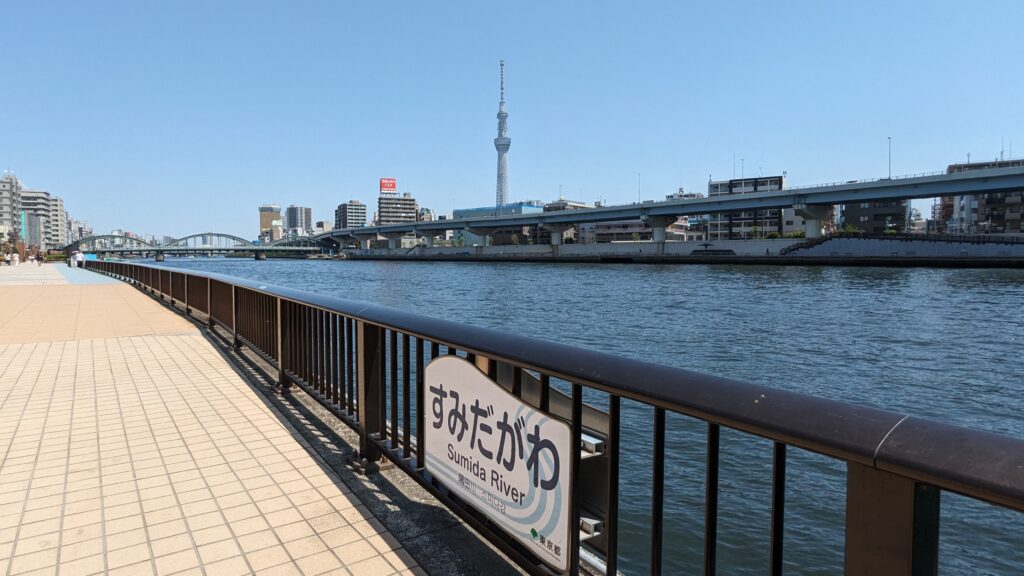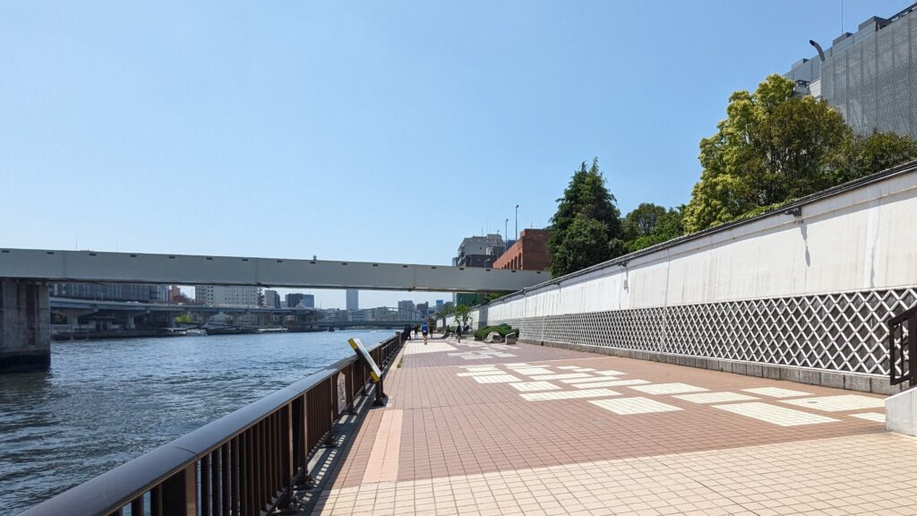 蔵前橋のたもとにある階段を降りると「隅田川」に出ます。