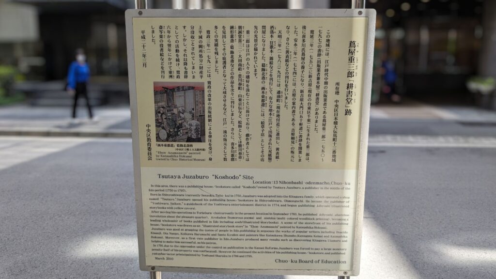 「蔦屋重三郎」は浮世絵師の喜多川歌麿や葛飾北斎を見出した、江戸時代の版元であり敏腕プロデューサーで、その「蔦屋重三郎」のお店「耕書堂」があった場所です。