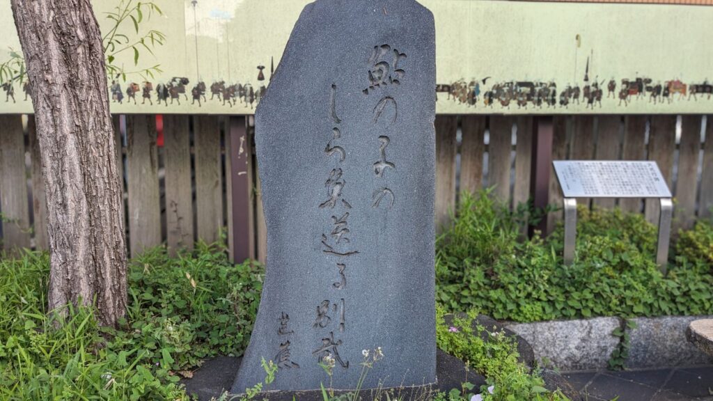 大名行列の絵と説明板、その前にある石碑は松尾場所が旅立ちに際して詠んだ句碑があります。