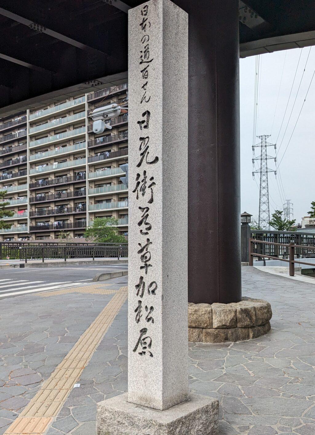 しばらく進むと、もう一つの太鼓橋「百代橋」が現れます。 『おくのほそ道』の有名な冒頭文「月日は百代の過客にして…」から名付けられた橋です。 矢立橋で絶景は堪能したので、今回は体力温存のために橋の下をくぐって進みます(笑)。 橋の下には「日本の道百選 日光街道草加松原」の碑が立っていました。