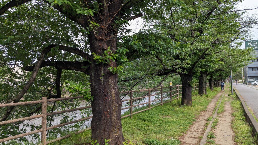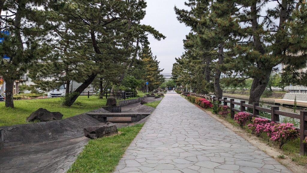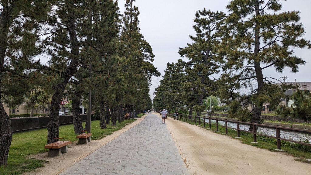矢立橋を降りると、約1.5kmにわたる松並木の遊歩道が続きます。 右手を流れる綾瀬川、整備された石畳、そして空を覆うような松の枝ぶり。 電柱などもなく開放的な景色の中を歩くのは、本当に気持ちが良いものです。遊歩道沿いにはベンチも点在しているので、私たちも松の木陰で水分補給休憩を取りました。