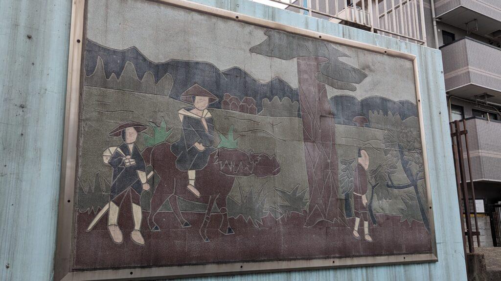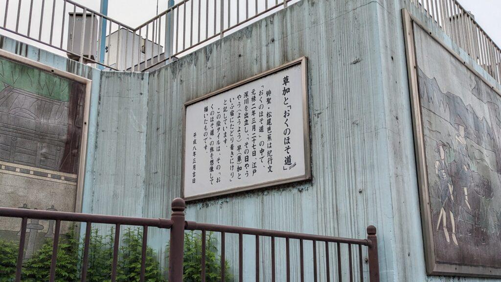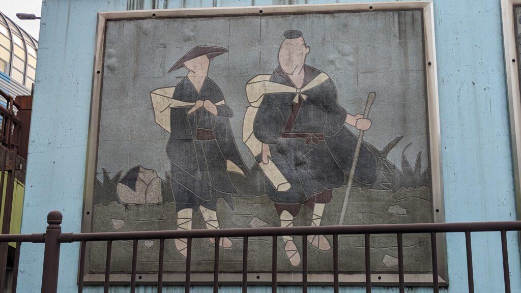 東京外環自動車道の下をくぐるトンネルの出口には、松尾芭蕉と河合曾良の旅の様子を描いたタイル画がありました。殺風景になりがちなトンネルも、こうした演出があるだけで楽しくなりますね(松原の中にあった方がもっと目立つ気もしますが…笑)。