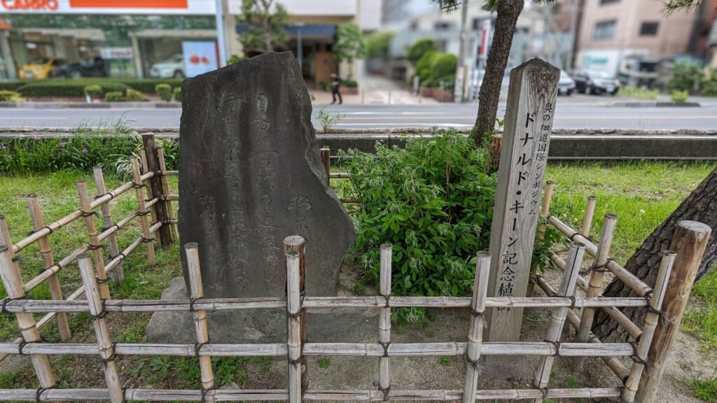 道の途中、「国指定名勝 おくのほそ道の風景地 草加松原」の碑を見つけました。 そこには、草加市とゆかりの深かった日本文学者「ドナルド・キーン」氏の名前が刻まれており、記念植樹もありました。
