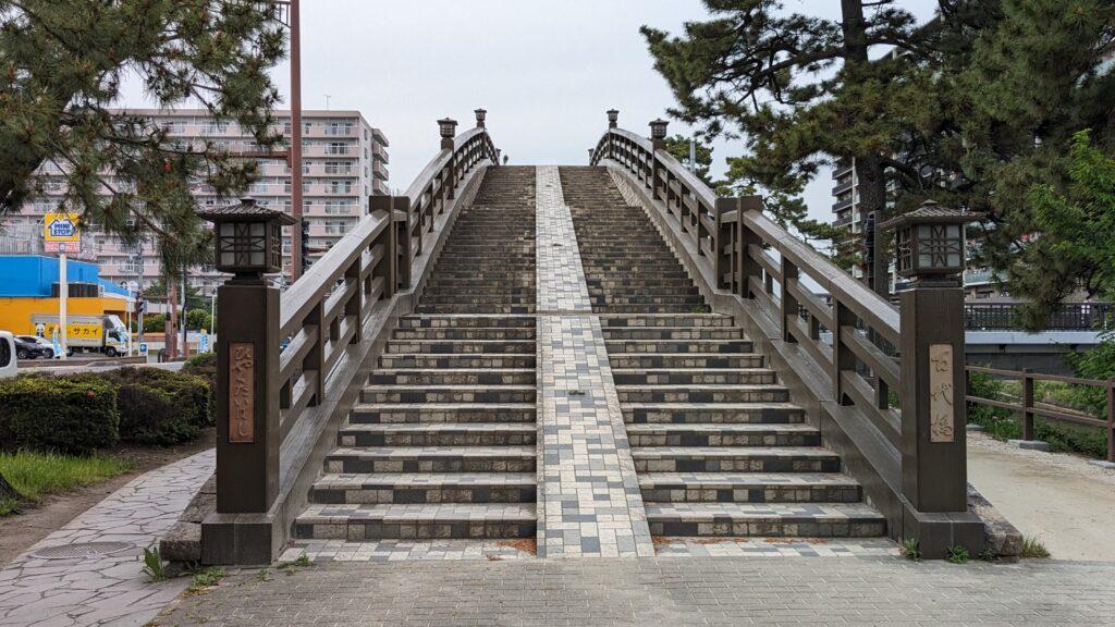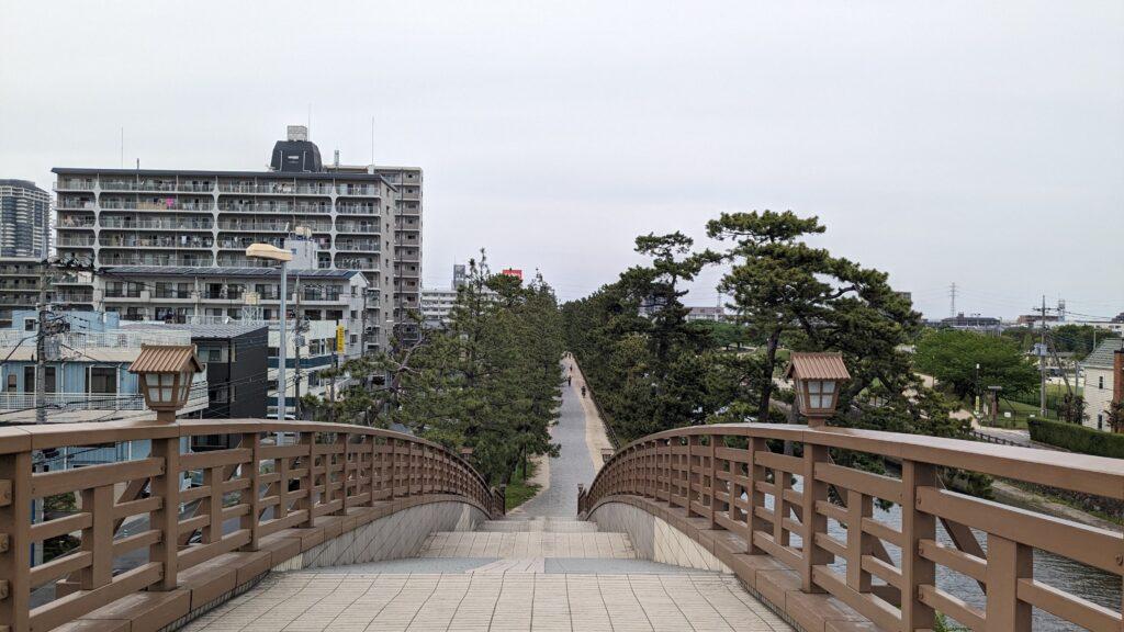 歩き始めてすぐ、松並木の中に堂々とした太鼓型の歩道橋が現れました。「矢立橋」です。 その名は、芭蕉が旅の途中で筆を立てて(矢立を取り出して)句を詠んだという故事にちなんでいるそうです。 景観を損なわない和風のデザインがお見事!