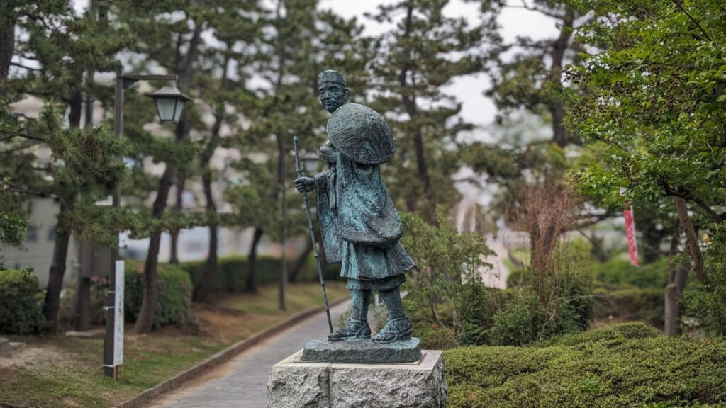 そして中央広場には…ありました!定番の「芭蕉と曾良の顔出しパネル」。 顔出しパネルが大好きな妻は、ここでも吸い寄せられるようにパネルの裏へ(笑)。 「撮るよ~」としぶしぶカメラを向けましたが、撮れた写真はかなりの傑作!旅の疲れも吹き飛ぶような笑顔(変顔?)に、あとで写真を見返すたびに笑ってしまいます。 何気ない瞬間ですが、夫婦旅ならではの良い思い出になりました。皆さんも旅の記念に一枚いかがですか?