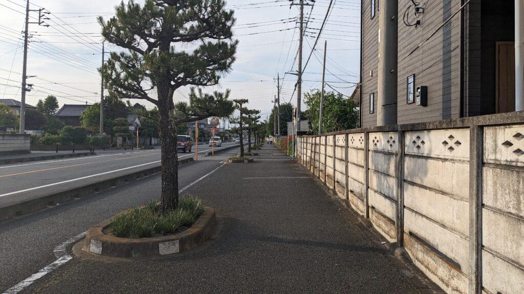 JR東北本線(宇都宮線)の中田踏切を渡ると、古河市茶屋新田に入ります。ここからは幅広い歩道が整備され、まっすぐに続いています。道中には、若い松が植えられています。
