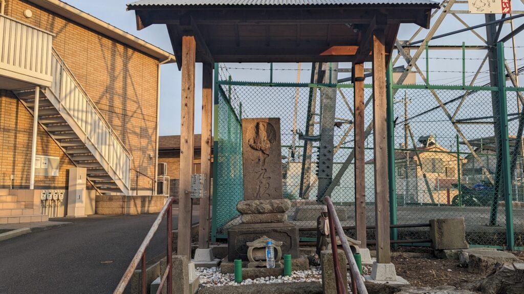 踏切を渡り、松原の入口から約2.5kmほど進むと、「茨城県立古河第二高等学校」の丁字路にたどり着きます。その一角には「十九夜」と刻まれた歴史ある石塔がひっそりと佇んでいます。
