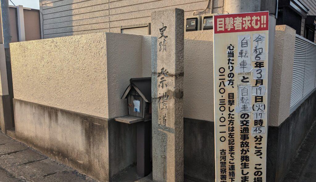 さらに500mほど進んだところにある民家の脇には「史跡祭禮道」と刻まれた石柱が静かに佇んでいます。この石柱は、江戸時代お雀神社の大祭が行われる際、旅人が御神体の前を通ることができなかったために、この場所が迂回路として使われていたといいます。