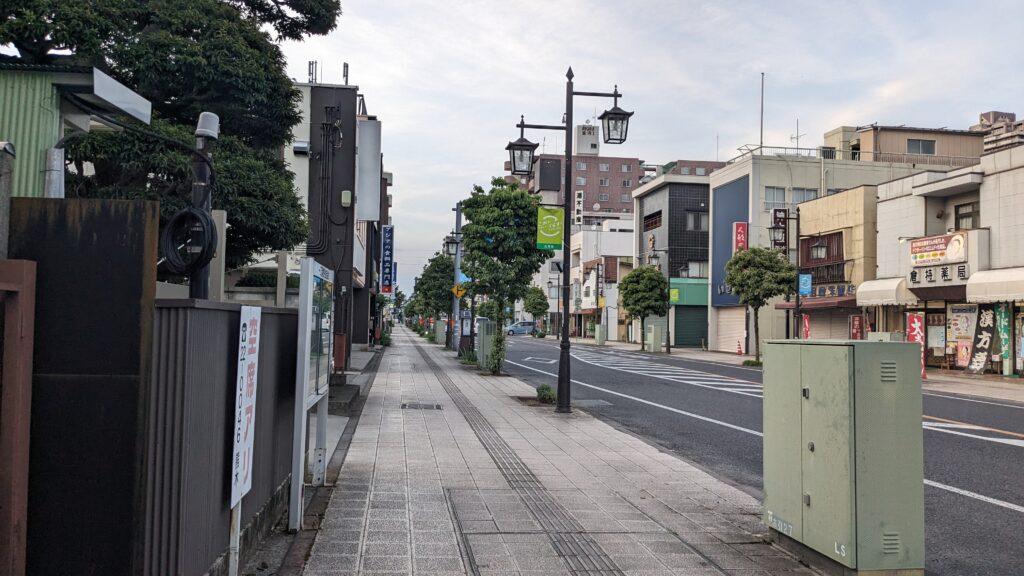 古河のメインストリートに入ると、整然とした街並みが広がります。美しい景観の中に点在する案内板を兼ねた灯篭が、街の雰囲気を一層引き立てています。