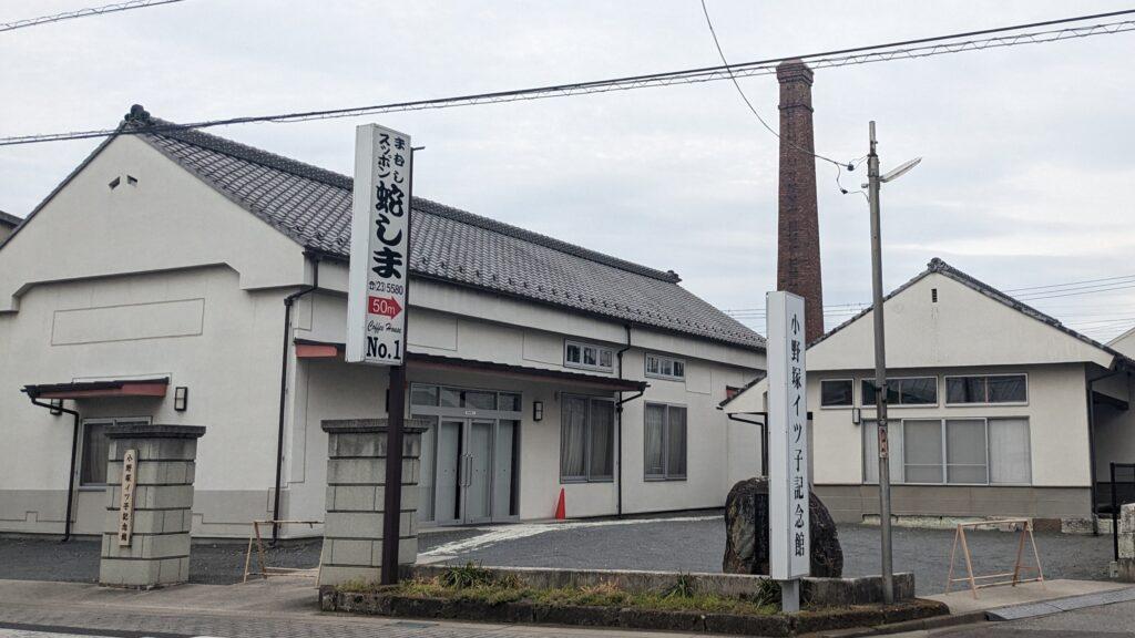その先右手に「小野塚イツ子記念館」が現れます。奥にそびえる煙突が印象的です。