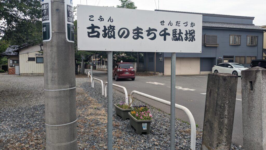 街道をしばらく歩き、千駄塚信号交差点を越えて200mほど進むと、左側に「古墳のまち千駄塚」の標識が見えてきます。標識の先に続く横道の奥に、こんもりとした森が広がり、その中に千駄塚古墳があります。頂上には浅間神社が祀られています。