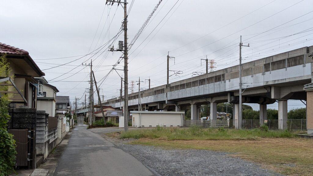 線路に沿って進みます。下を走っているのは宇都宮線、高架上を走っているのは東北新幹線です。この光景に、なぜか妻は興奮気味。新幹線の姿を動画に収めようとしていましたが、高架上を走っているため、走行音だけが響き渡り、姿を捉えることはできず残念がっていました。