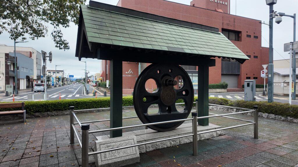 「C57蒸気機関車の動輪」が展示されています。この地が鉄道の発展とともにあったことが碑に刻まれています。