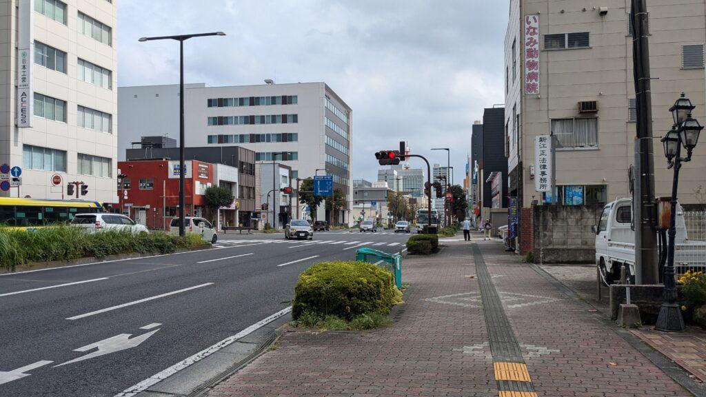 駅前からまっすぐ進むと、日光街道にぶつかります。この道の突き当たりが、昨日の歩き旅を終えた場所となります。