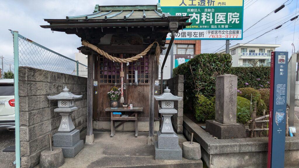 1059(康平2)年初代下野国司宇都宮宗円が欧州征伐の戦勝を祈願して彫った不動尊が祀られています。宇都宮城乾の守護仏でした。