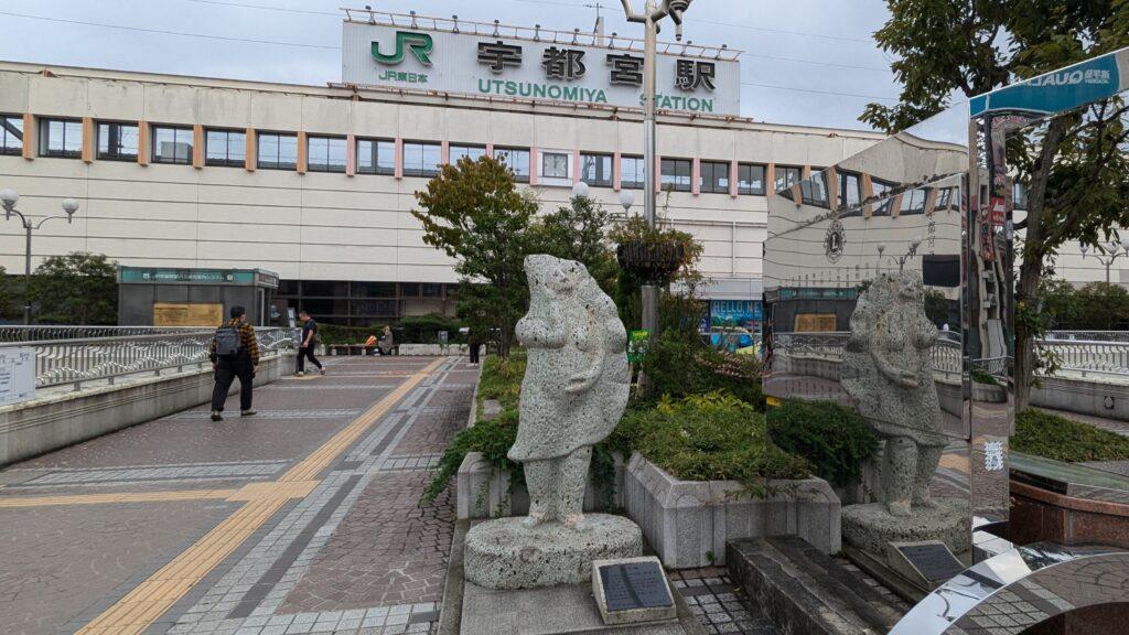 宇都宮駅前にはシンボルの餃子像が。女神だったんですね。地元大谷石を使用しています。