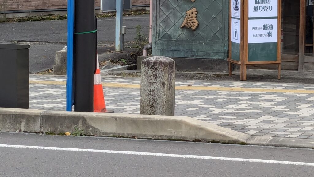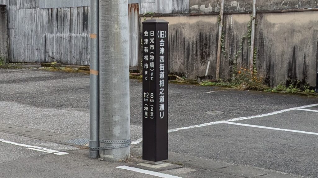お店の前には「今市町道路元標」、道の向かい側(右手)には旧会津西街道追分の標柱が立っています。