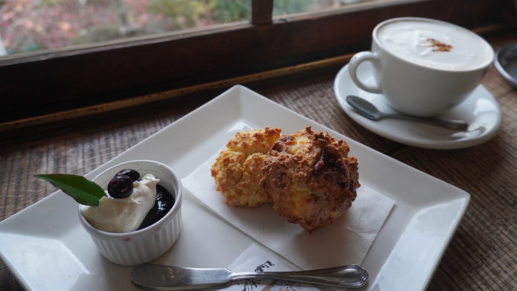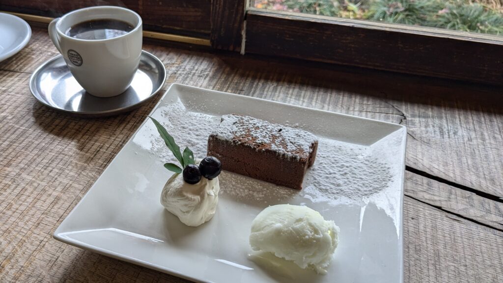 香り豊かな自家焙煎のハンドドリップコーヒーと、ゴツゴツとしたスコーンやガトーショコラのケーキプレートをいただきながら一服。旅の疲れが一気に癒され、思わず旅を再開するのを忘れてしまいそうでした。